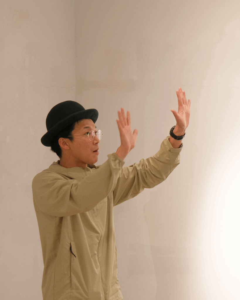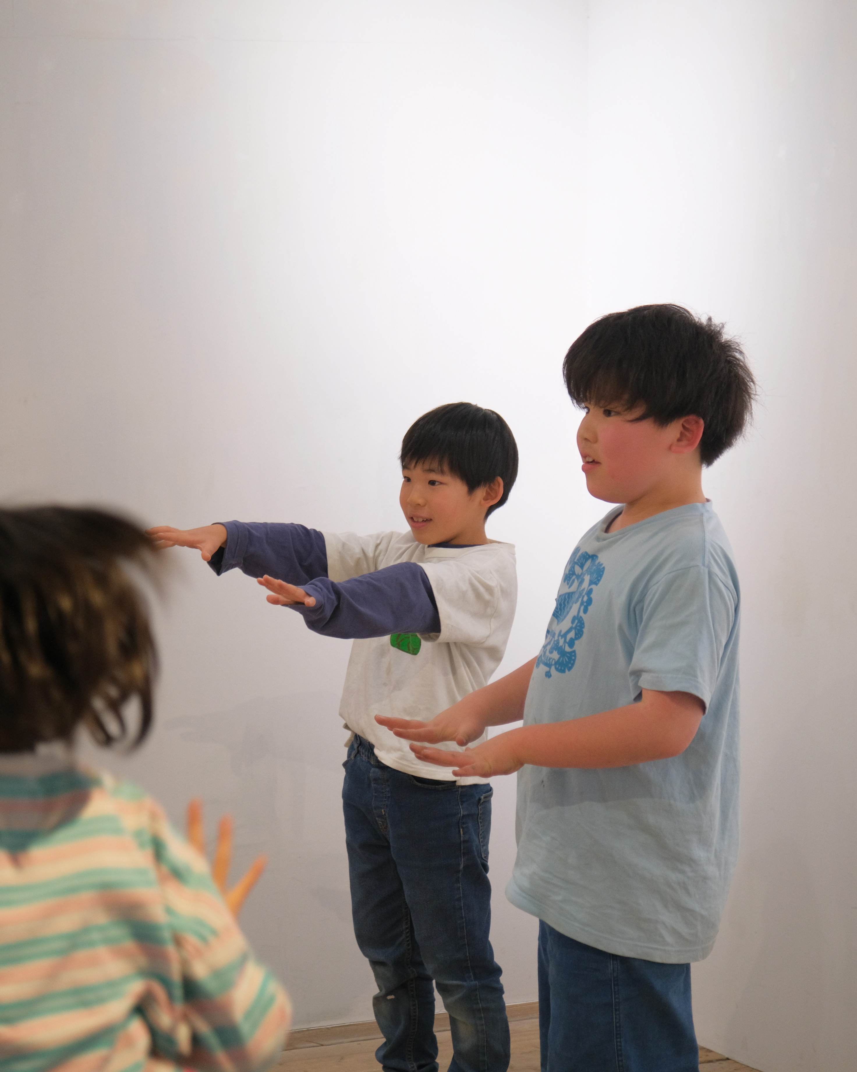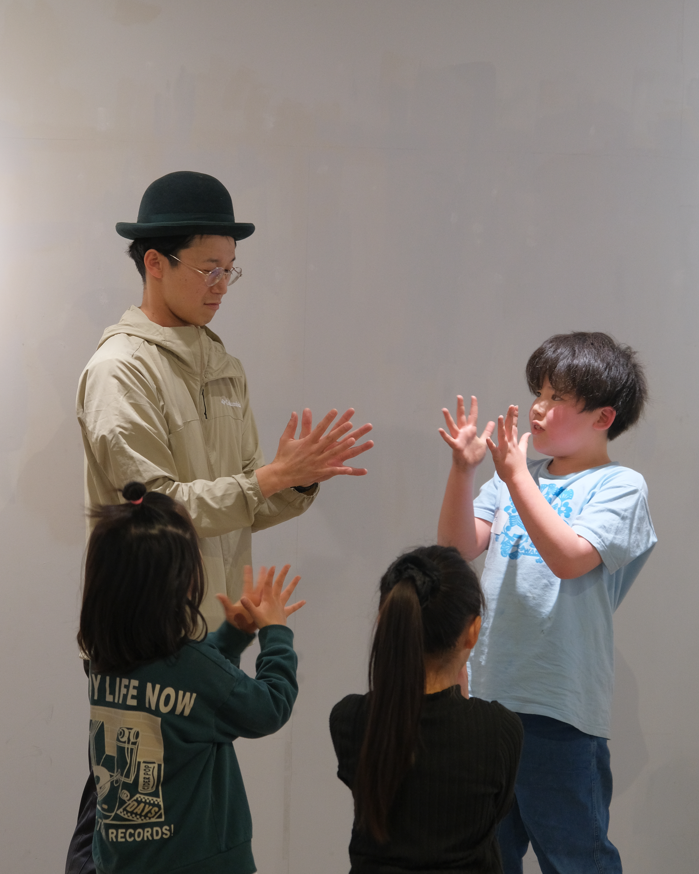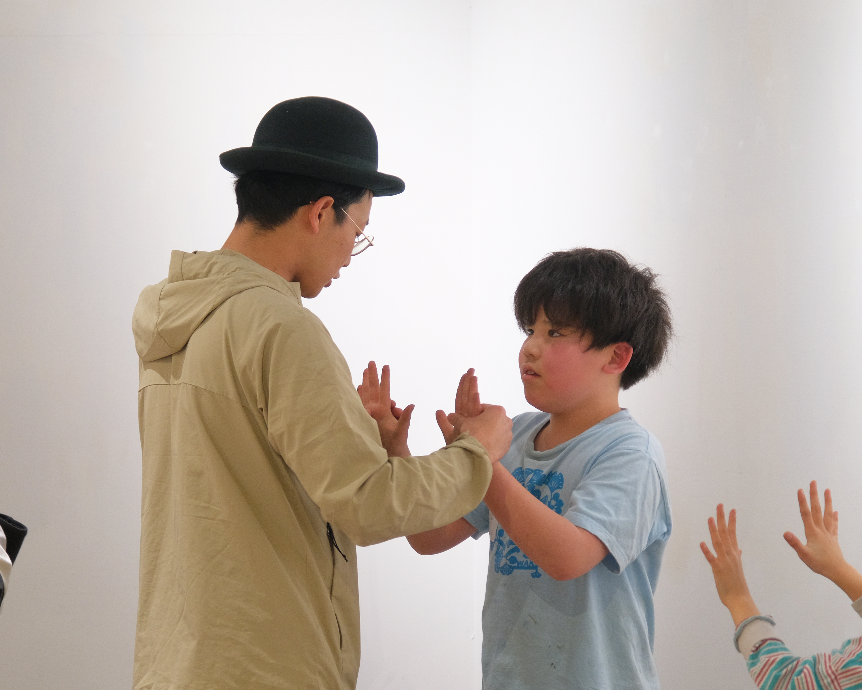 荷物を置いたら、さぁ授業スタート! みんなで遊びながら、体を使う練習をしていきます。思わず私も参加したくなったのは「パントマイムしりとり」。声を出さずに言葉を表現し、しりとりで繋いでいきます。慣れてきたら、いよいよパントマイムにチャレンジ! 最初に挑戦したのは、壁のパントマイム。金子しんぺいさんと手の動かし方を練習したら、あっという間にこどもたちの目の前に透明な壁が出現! クラスの最後に、こどもたちがどんなパフォーマンスを見せてくれるのか、どうぞお楽しみに!