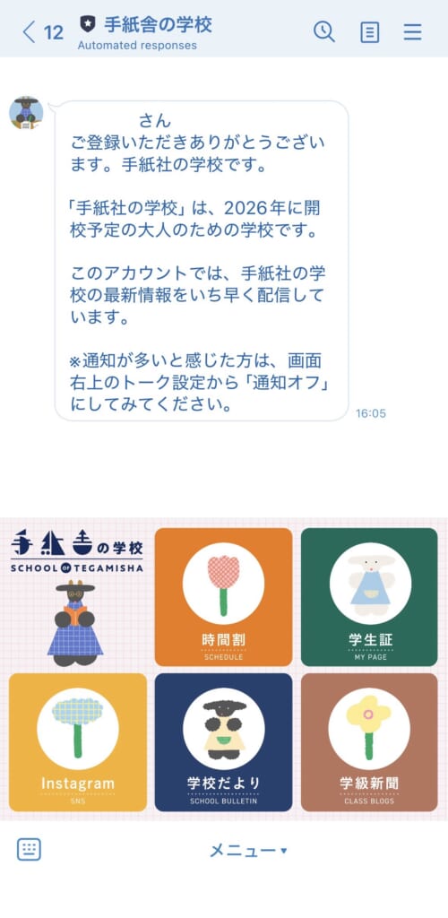 LINEの「手紙舎の学校」公式アカウント(ID:tegamisha_school)ができました! 学校生活が便利になる機能が盛りだくさん。この機会にぜひお友だち登録をよろしくお願いいたします。