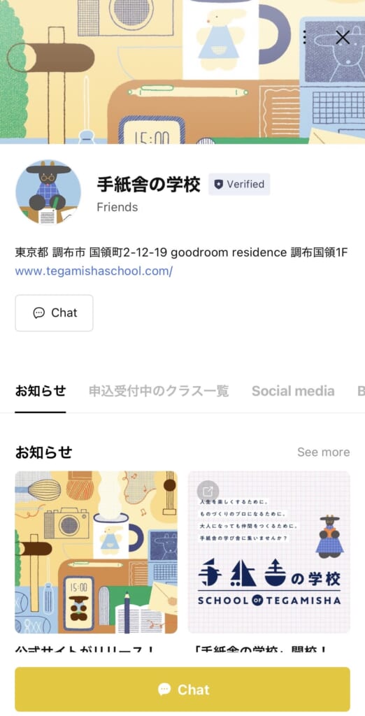 公式アカウントのプロフィールページでは、学校からのお知らせや現在申込受付中のクラス、イベント情報などを掲載。手紙舎の学校の今がひと目でわかります!